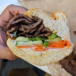 Biggest Banh Mi I've ever had! I had the 5-spice chicken and it was super good. I wish they would have cut the chicken a bit thinner to make it less messy and easier to eat. The meat was flavorful and juicy. It was on the pricey side but that's what's expected in downtown SF. Easy walk from my office and there's tables inside. I'd definitely come back.