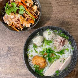 Solid lunch spot. The service is quick, and my takeout was ready 15 minutes after I ordered it online at noon on a weekday. There are about 5 tables inside for eating in. I recommend ordering on the phone or in person. I think they didn't notice the instructions in my online order about my allergy, but when I brought it up in the restaurant, they were very quick to remedy the issue and prepare a new entree (sans allergen) for me. I had the bun thit nuong (grilled pork with vermicelli noodles). The meat marinade was very tasty and true to the dish. The noodles were cooked well. I wish there had been more noodles (relative to the amount of veggies), but this wasn't a dealbreaker. The portion size for the price ($15.50, incl. tax) was typical of a downtown lunch spot. I wasn't stuffed afterward, but I felt moderately full. See my photos for the size of the takeout box relative to an iphone. Next time, I might order an egg roll or an appetizer in addition to an entree.